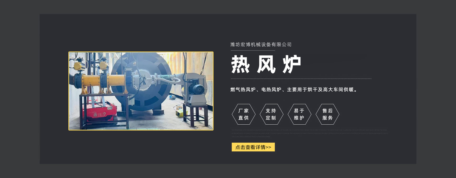 濰坊宏博機(jī)械設(shè)(shè)備有限公司是從事熱風(fēng)(fēng)爐、烘干設(shè)(shè)備、供暖設(shè)(shè)備的研發(fā)(fā)、設(shè)(shè)計(jì)、制造和服務(wù)(wù)于一體的實(shí)體企業(yè)(yè)。長(zhǎng)期以來,企業(yè)(yè)以市場(chǎng)的發(fā)(fā)展和客戶的需求為導(dǎo)(dǎo)向,集多年的生產(chǎn)(chǎn)技術(shù)(shù)與經(jīng)(jīng)驗(yàn)為一體,不斷開發(fā)(fā)和優(yōu)(yōu)良產(chǎn)(chǎn)品。